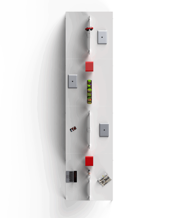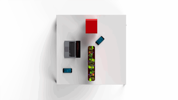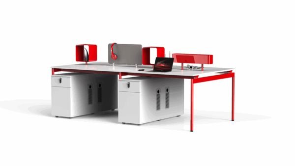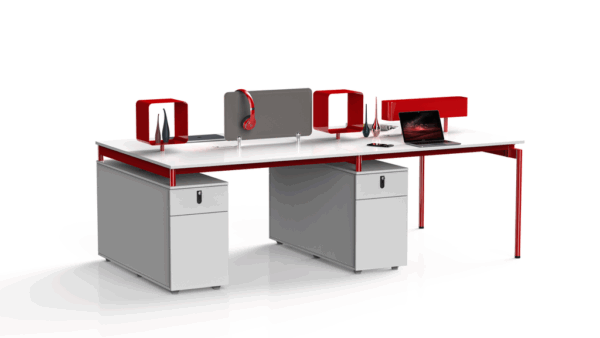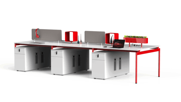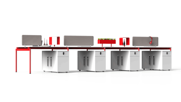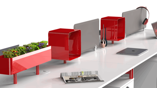 Modern workstation with a red metal frame, integrated planter, and secure storage. Available in various sizes to fit your workspace needs.