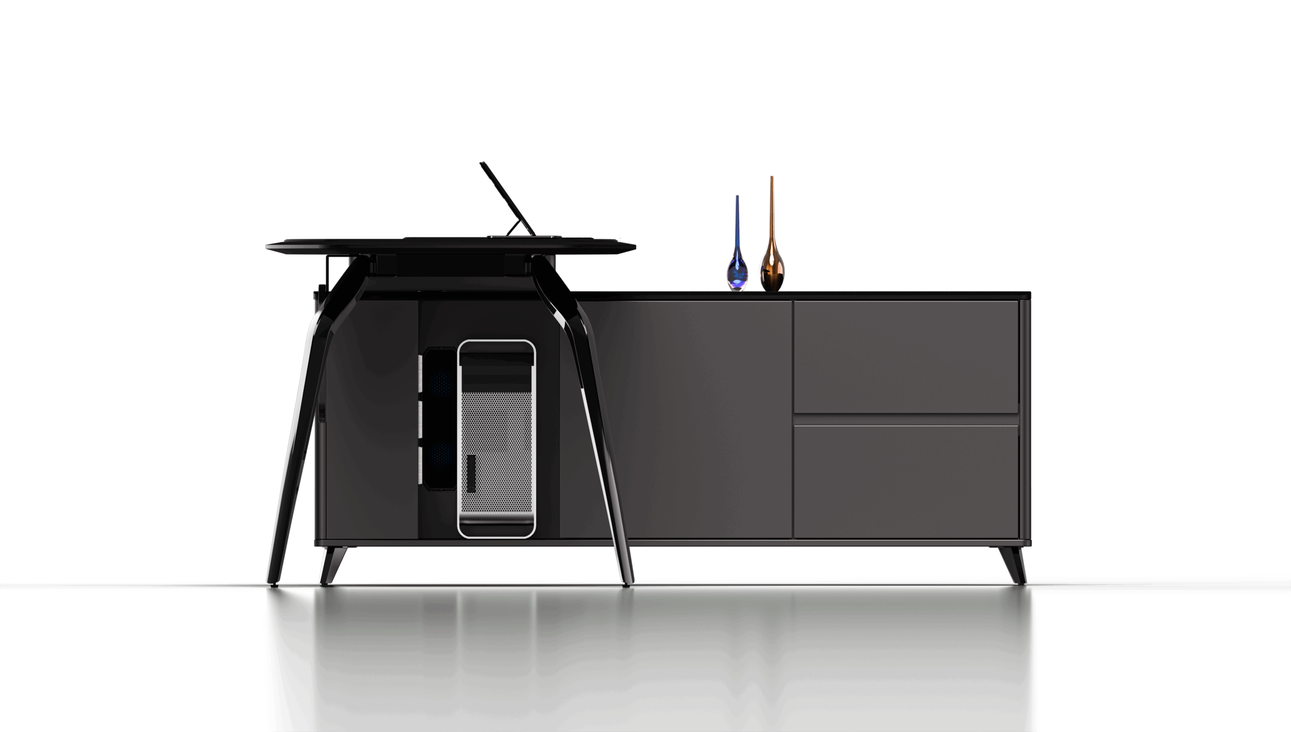 The Modern Executive Desk combines sleek design with practicality, offering a spacious surface for dual monitors and essentials.